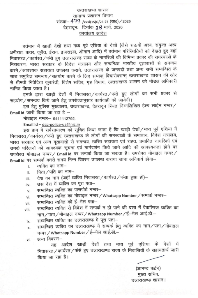खाड़ी देशों और मध्य पूर्व एशिया में रह रहे या किसी कारणवश वहां फंसे उत्तराखंड के नागरिकों के लिए राज्य सरकार ने एक बेहद अहम और संवेदनशील फैसला लिया है। अपनी माटी से दूर विदेशों में मुश्किलों का सामना कर रहे प्रदेशवासियों की मदद के लिए सरकार ने त्वरित कार्रवाई करते हुए एक नोडल अधिकारी की नियुक्ति कर दी है।
