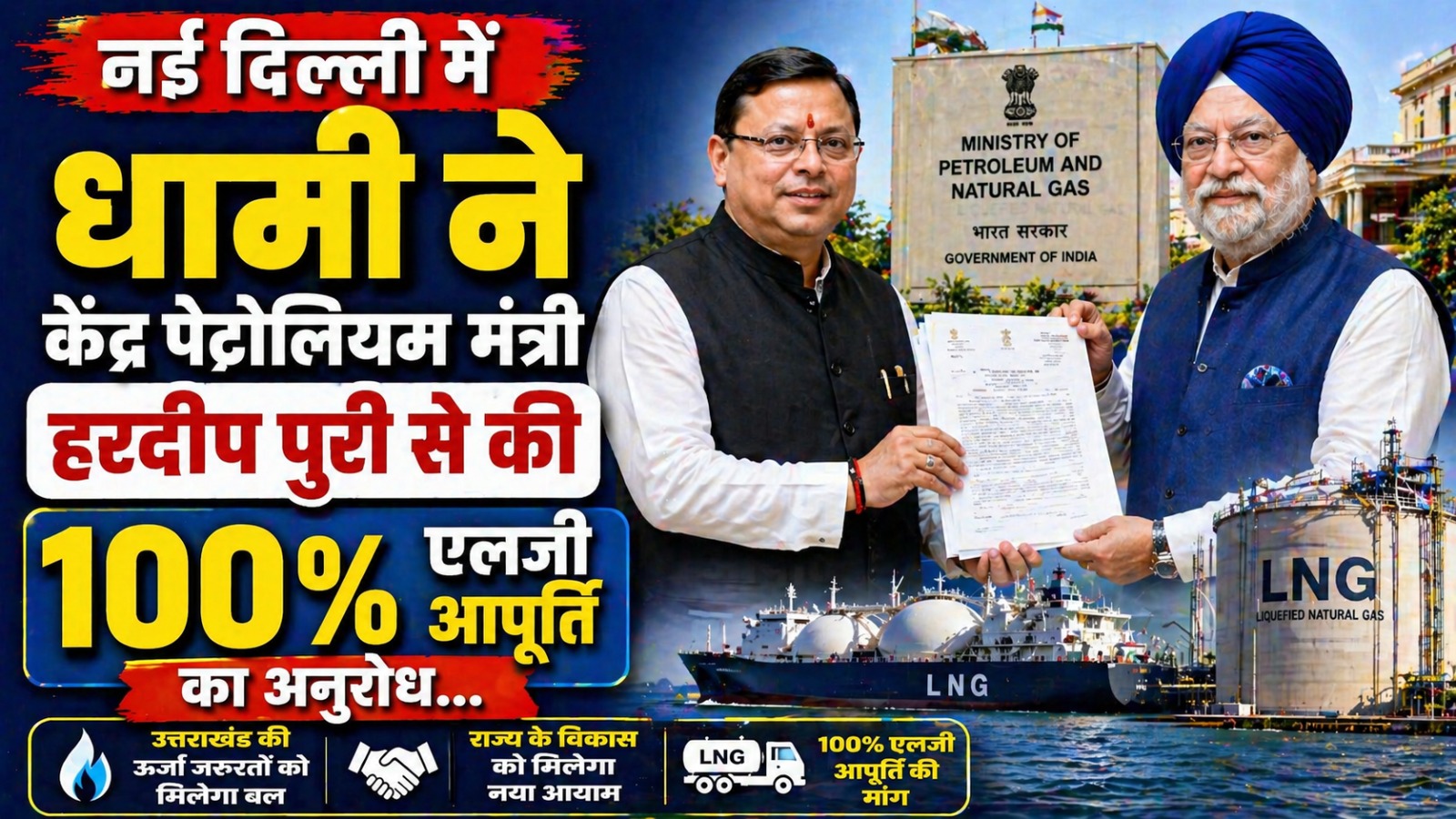 मुख्यमंत्री धामी ने केंद्रीय पेट्रोलियम मंत्री हरदीप सिंह पुरी से की मुलाकात उन्होंने चार धाम यात्रा के लिए व्यवसायिक एलपीजी सिलेंडरों की 100% आपूर्ति बनाए रखने और आपदा राहत के लिए अतिरिक्त 5% आवंटन का अनुरोध किया।